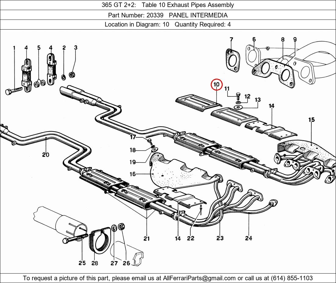 Ferrari Part Number 20339, PANEL INTERMEDIA shown here as used in 365 GT 2+2 Table 10 Exhaust Pipes Assembly. Location in Diagram: 10. Required Quantity: 4. This Ferrari part is used in more than one diagram. Click on the diagrams below to see alternative uses of this part: