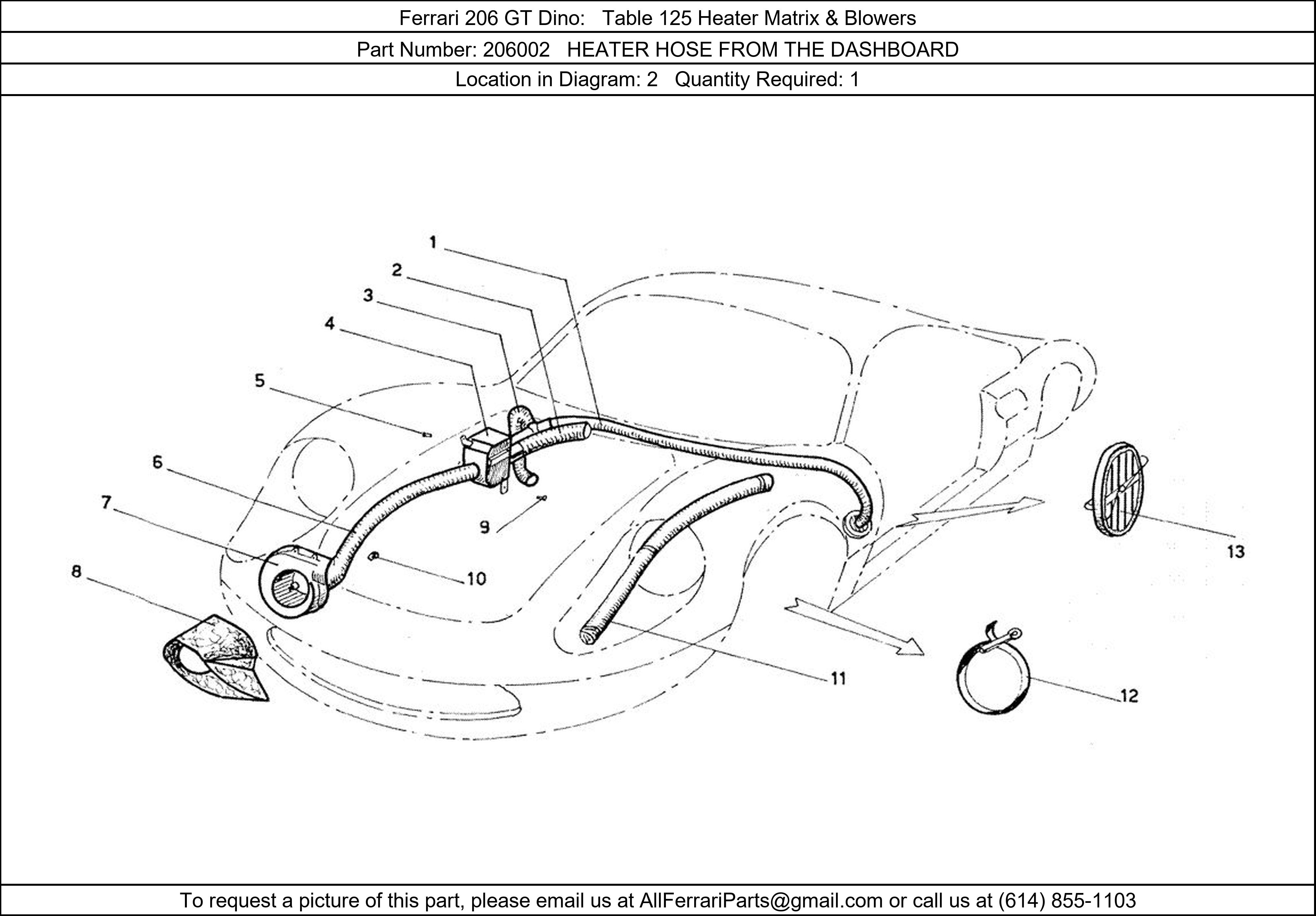 Ferrari Part 206002, HEATER HOSE FROM THE DASHBOARD, shown here as used in Ferrari 206 GT Dino Table 125 Heater Matrix & Blowers.