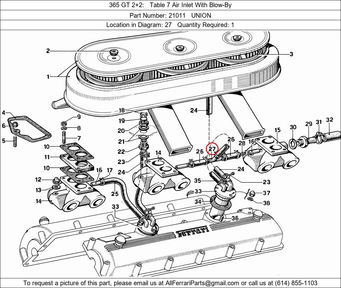 Ferrari Part Number 21011, UNION shown here as used in 365 GT 2+2 Table 7 Air Inlet With Blow-By. Location in Diagram: 27. Required Quantity: 1. This Ferrari part is used in more than one diagram. Click on the diagrams below to see alternative uses of this part: