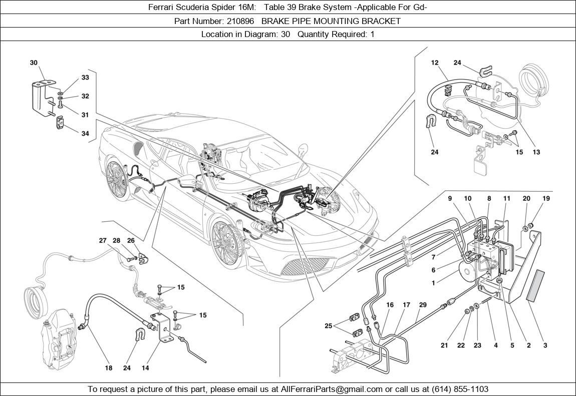 Ferrari Part 210896, BRAKE PIPE MOUNTING BRACKET, shown here as used in Ferrari Scuderia Spider 16M Table 39 Brake System -Applicable For Gd-.