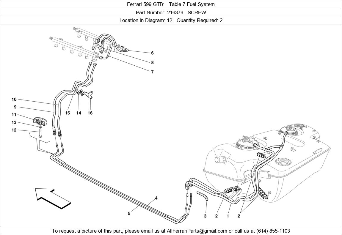 Ferrari Part 216379, SCREW, shown here as used in Ferrari 599 GTB Table 7 Fuel System. Other uses of this part are shown below: