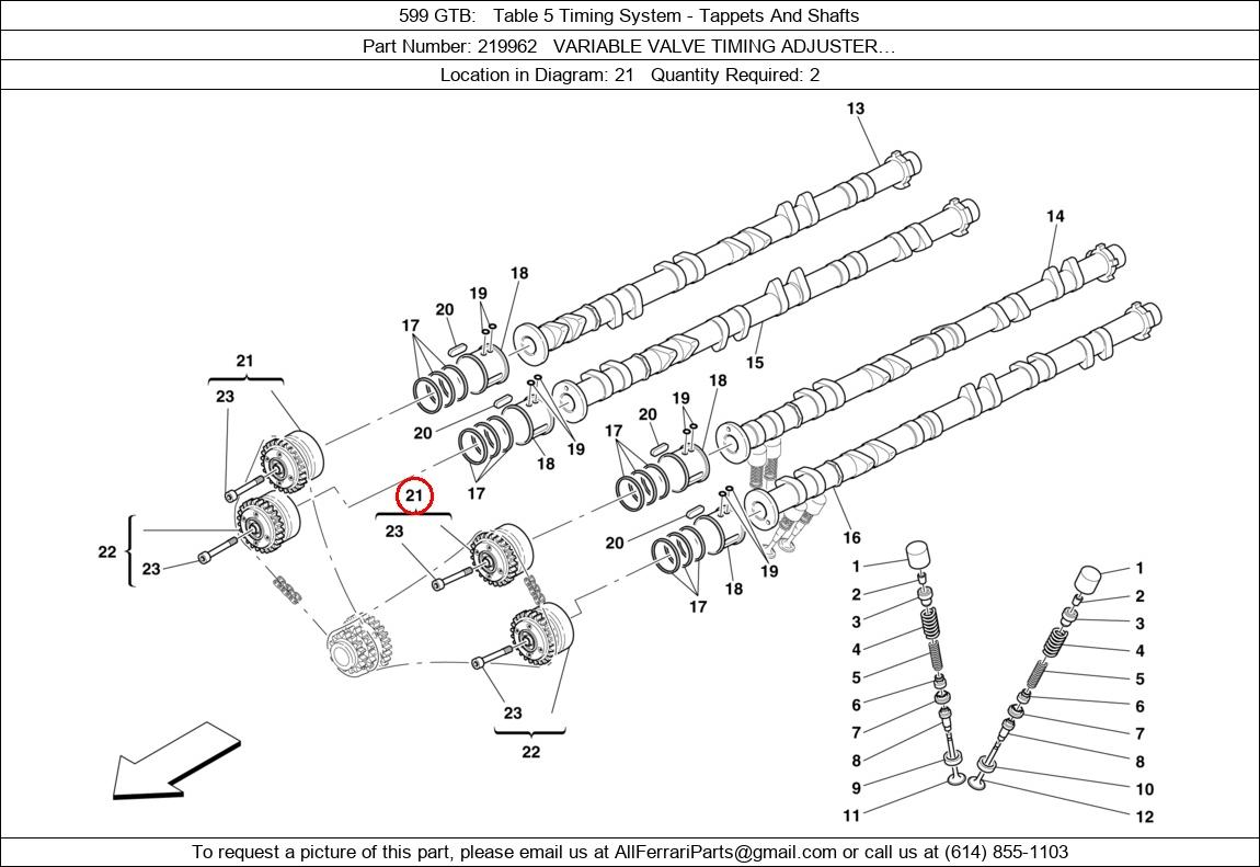 Ferrari Part Number 219962, VARIABLE VALVE TIMING ADJUSTER… shown here as used in 599 GTB Table 5 Timing System - Tappets And Shafts. Location in Diagram: 21. Required Quantity: 2