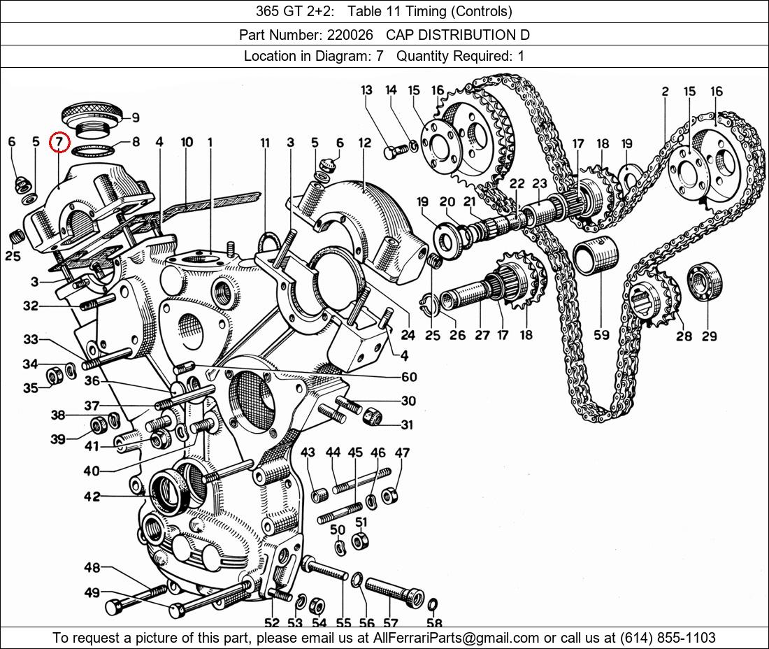 Ferrari Part Number 220026, CAP DISTRIBUTION D shown here as used in 365 GT 2+2 Table 11 Timing (Controls). Location in Diagram: 7. Required Quantity: 1. This Ferrari part is used in more than one diagram. Click on the diagrams below to see alternative uses of this part: