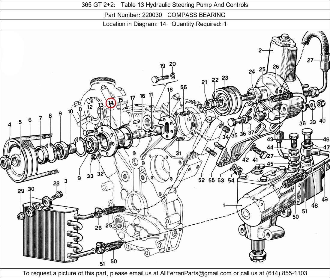 Ferrari Part Number 220030, COMPASS BEARING shown here as used in 365 GT 2+2 Table 13 Hydraulic Steering Pump And Controls. Location in Diagram: 14. Required Quantity: 1