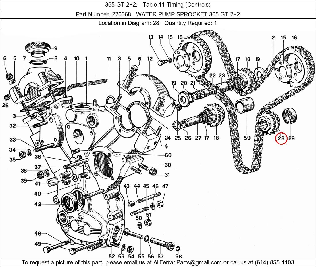 Ferrari Part Number 220068, WATER PUMP SPROCKET 365 GT 2+2 shown here as used in 365 GT 2+2 Table 11 Timing (Controls). Location in Diagram: 28. Required Quantity: 1