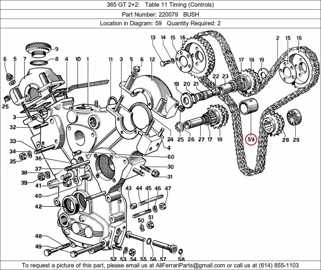 Ferrari Part Number 220079, BUSH shown here as used in 365 GT 2+2 Table 11 Timing (Controls). Location in Diagram: 59. Required Quantity: 2