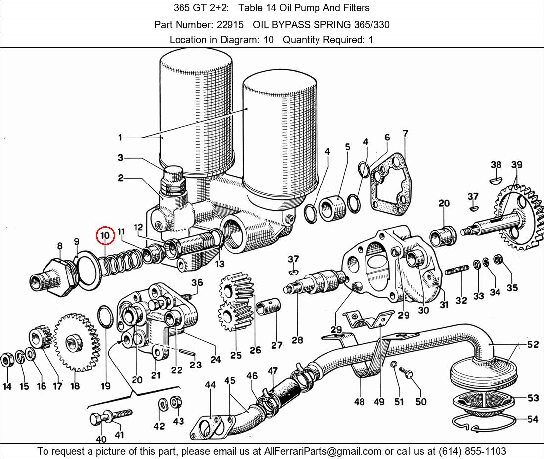 Ferrari Part Number 22915, OIL BYPASS SPRING 365/330 shown here as used in 365 GT 2+2 Table 14 Oil Pump And Filters. Location in Diagram: 10. Required Quantity: 1. This Ferrari part is used in more than one diagram. Click on the diagrams below to see alternative uses of this part: