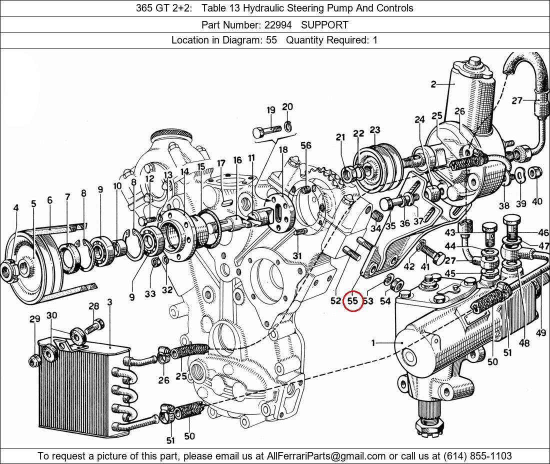 Ferrari Part Number 22994, SUPPORT shown here as used in 365 GT 2+2 Table 13 Hydraulic Steering Pump And Controls. Location in Diagram: 55. Required Quantity: 1