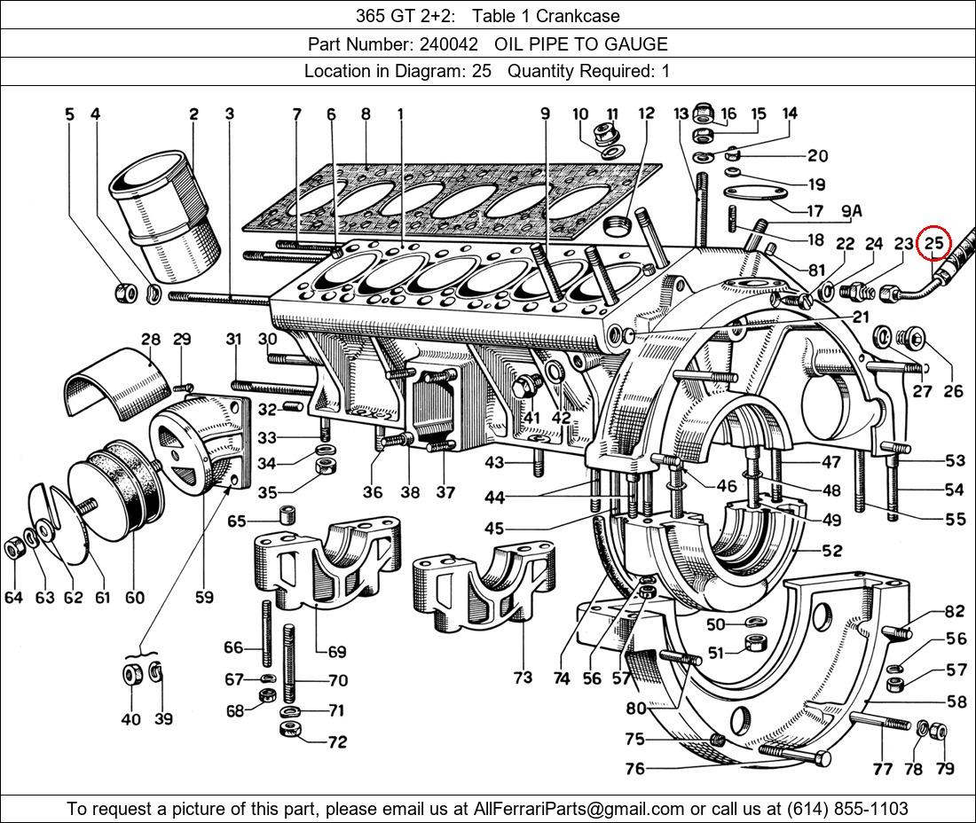 Ferrari Part Number 240042, OIL PIPE TO GAUGE shown here as used in 365 GT 2+2 Table 1 Crankcase. Location in Diagram: 25. Required Quantity: 1. This Ferrari part is used in more than one diagram. Click on the diagrams below to see alternative uses of this part: