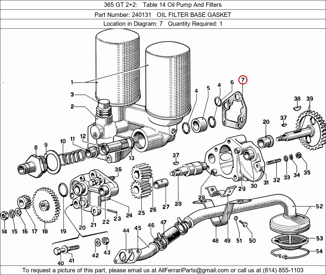 Ferrari Part Number 240131, OIL FILTER BASE GASKET shown here as used in 365 GT 2+2 Table 14 Oil Pump And Filters. Location in Diagram: 7. Required Quantity: 1. This Ferrari part is used in more than one diagram. Click on the diagrams below to see alternative uses of this part: