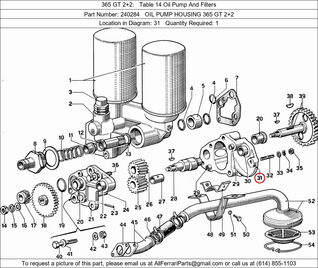 Ferrari Part Number 240284, OIL PUMP HOUSING 365 GT 2+2 shown here as used in 365 GT 2+2 Table 14 Oil Pump And Filters. Location in Diagram: 31. Required Quantity: 1
