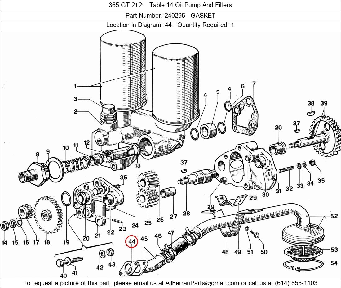 Ferrari Part Number 240295, GASKET shown here as used in 365 GT 2+2 Table 14 Oil Pump And Filters. Location in Diagram: 44. Required Quantity: 1