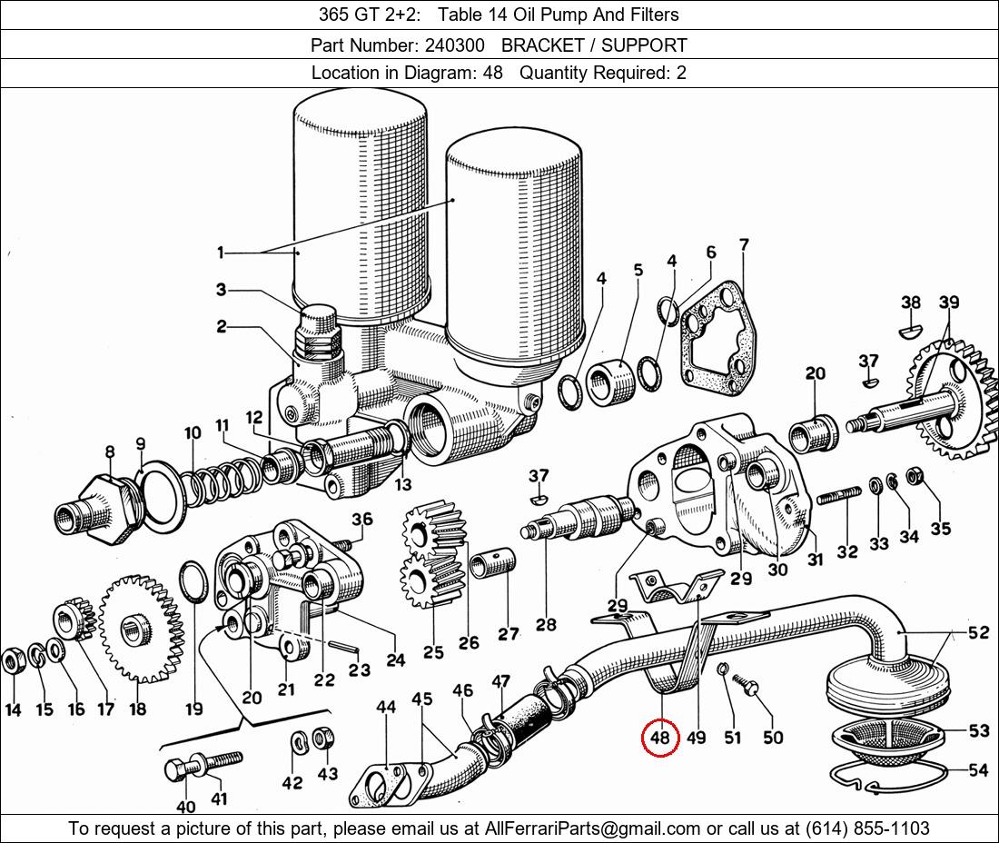 Ferrari Part Number 240300, BRACKET / SUPPORT shown here as used in 365 GT 2+2 Table 14 Oil Pump And Filters. Location in Diagram: 48. Required Quantity: 2. This Ferrari part is used in more than one diagram. Click on the diagrams below to see alternative uses of this part: