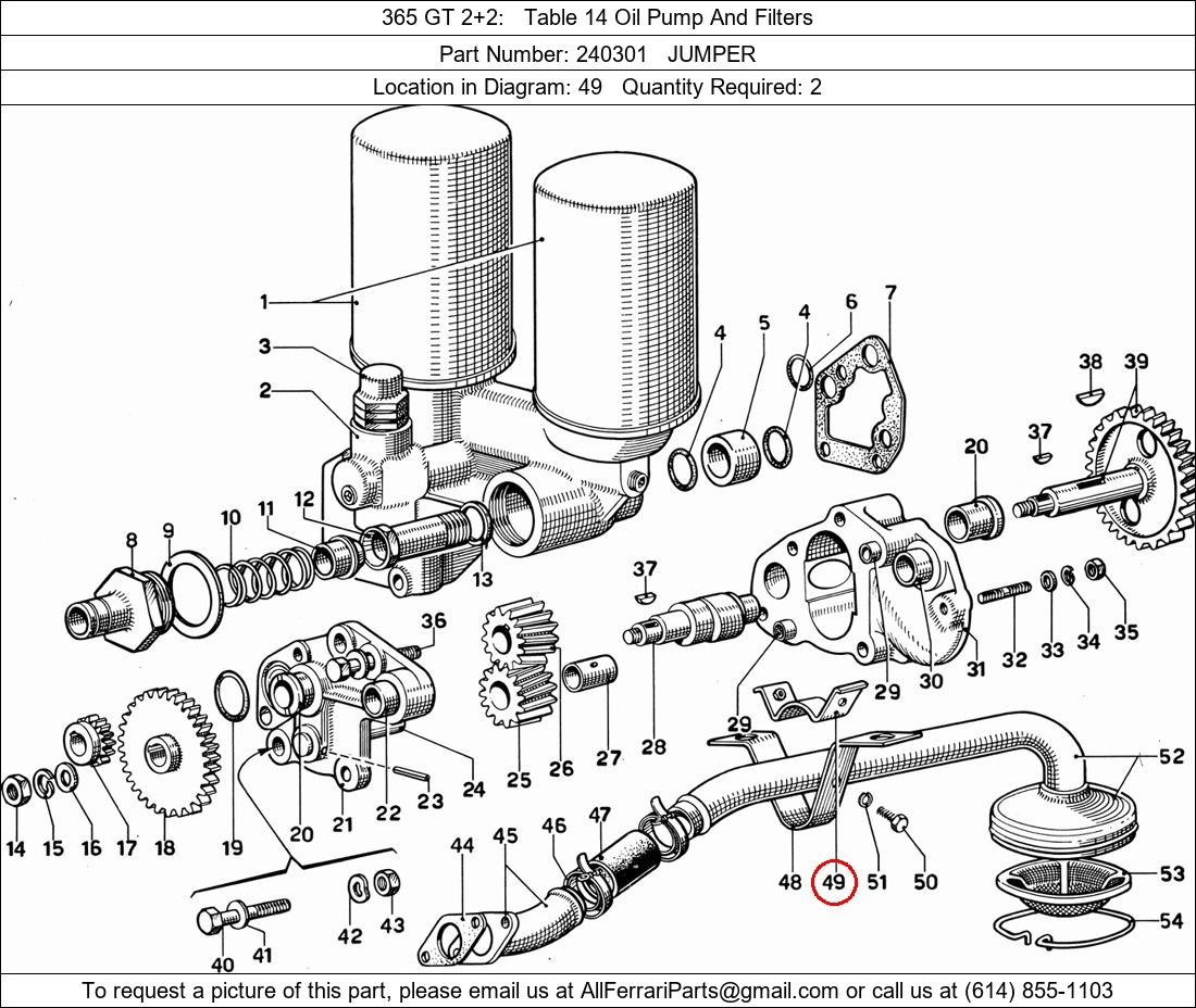 Ferrari Part Number 240301, JUMPER shown here as used in 365 GT 2+2 Table 14 Oil Pump And Filters. Location in Diagram: 49. Required Quantity: 2. This Ferrari part is used in more than one diagram. Click on the diagrams below to see alternative uses of this part: