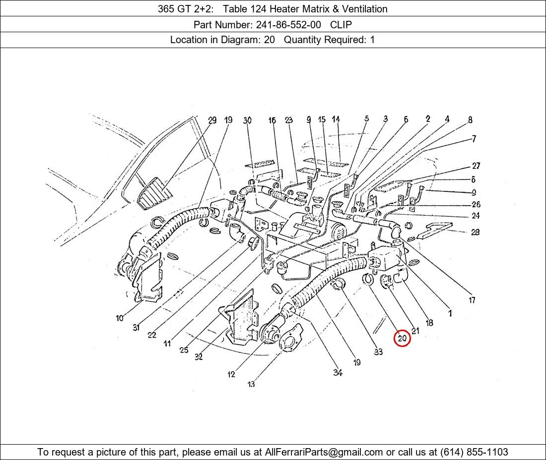 Ferrari Part Number 241-86-552-00, CLIP shown here as used in 365 GT 2+2 Table 124 Heater Matrix & Ventilation. Location in Diagram: 20. Required Quantity: 1. This Ferrari part is used in more than one diagram. Click on the diagrams below to see alternative uses of this part: