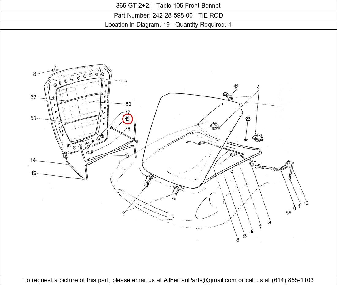 Ferrari Part Number 242-28-598-00, TIE ROD shown here as used in 365 GT 2+2 Table 105 Front Bonnet. Location in Diagram: 19. Required Quantity: 1. This Ferrari part is used in more than one diagram. Click on the diagrams below to see alternative uses of this part: