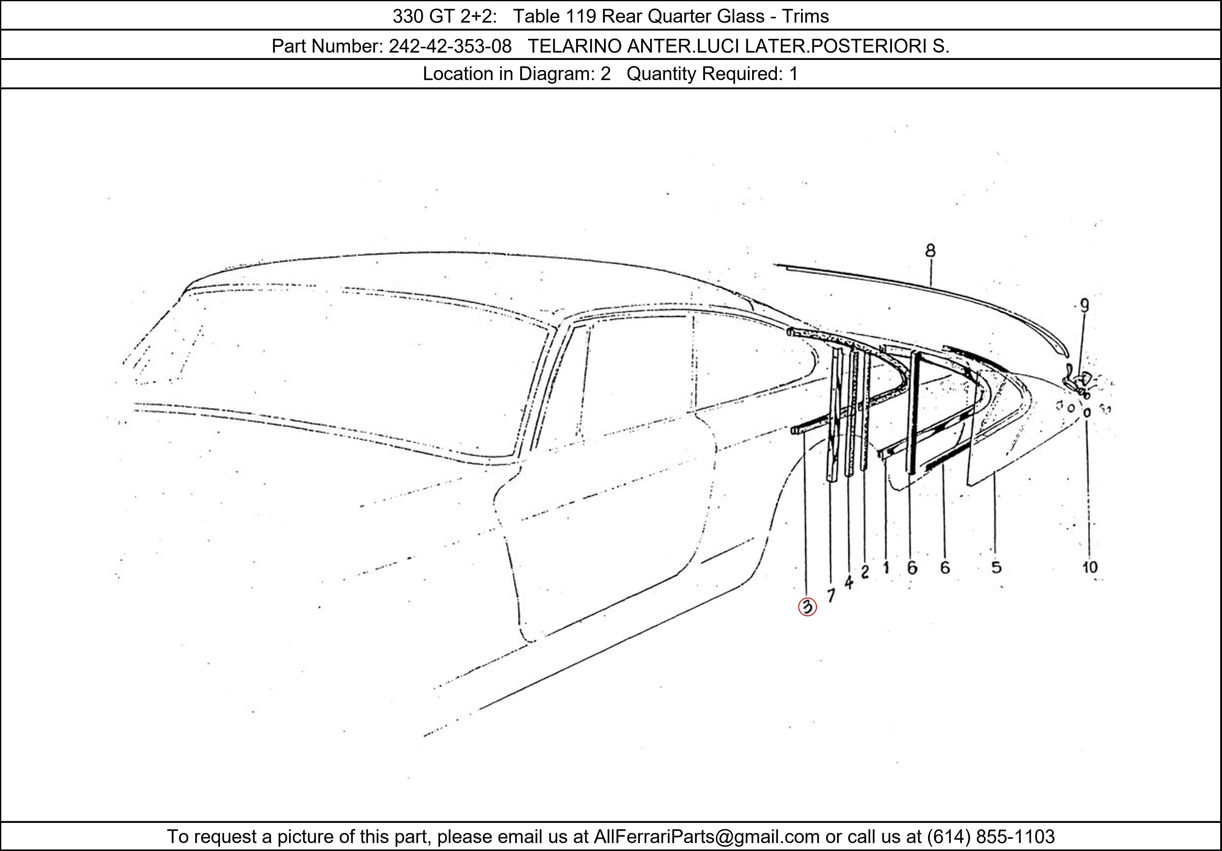 Ferrari Part Number 242-42-353-08, TELARINO ANTER.LUCI LATER.POSTERIORI S. shown here as used in 330 GT 2+2 Table 119 Rear Quarter Glass - Trims. Location in Diagram: 2. Required Quantity: 1