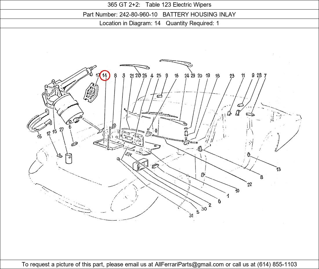 Ferrari Part Number 242-80-960-10, BATTERY HOUSING INLAY shown here as used in 365 GT 2+2 Table 123 Electric Wipers. Location in Diagram: 14. Required Quantity: 1