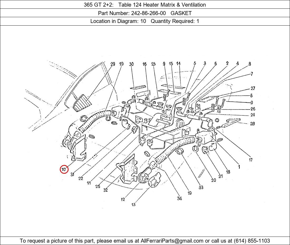Ferrari Part Number 242-86-266-00, GASKET shown here as used in 365 GT 2+2 Table 124 Heater Matrix & Ventilation. Location in Diagram: 10. Required Quantity: 1