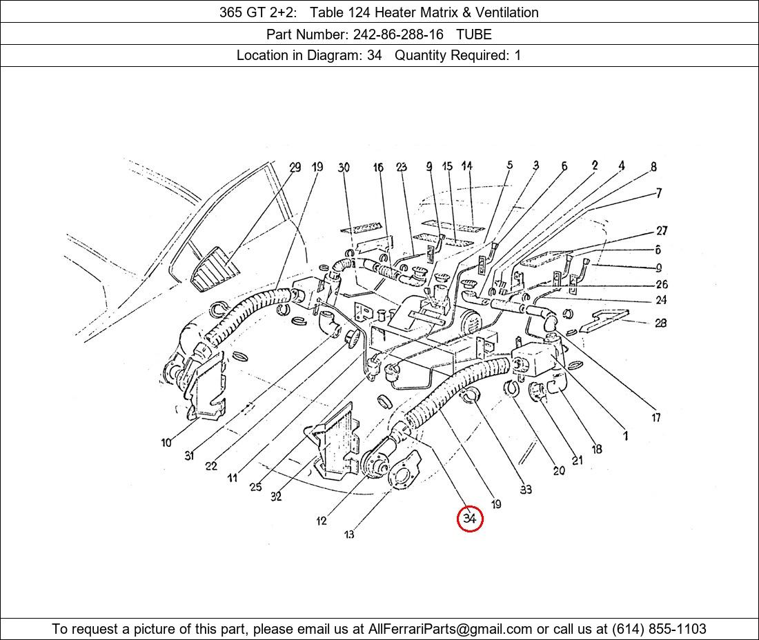 Ferrari Part Number 242-86-288-16, TUBE shown here as used in 365 GT 2+2 Table 124 Heater Matrix & Ventilation. Location in Diagram: 34. Required Quantity: 1