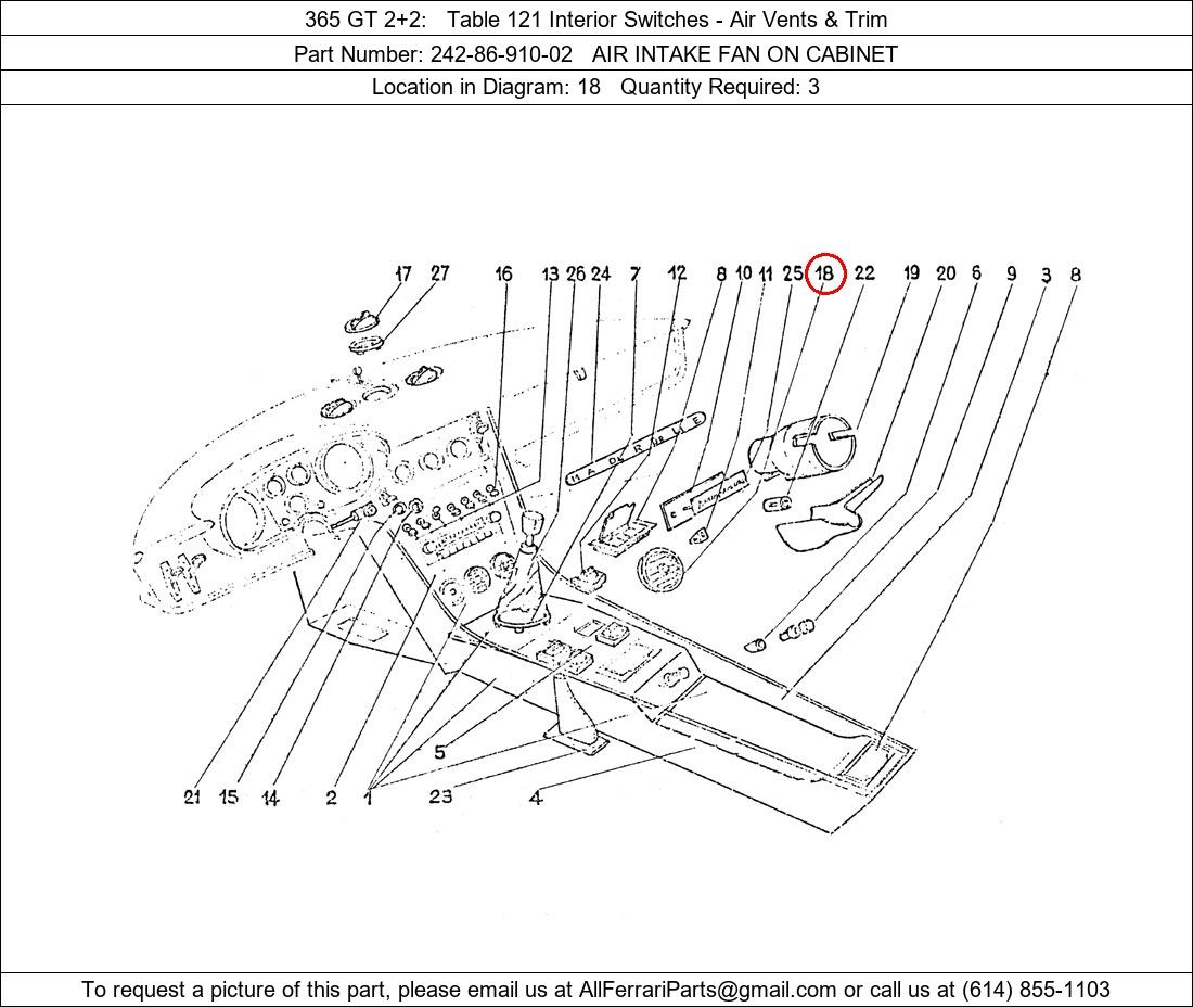 Ferrari Part Number 242-86-910-02, AIR INTAKE FAN ON CABINET shown here as used in 365 GT 2+2 Table 121 Interior Switches - Air Vents & Trim. Location in Diagram: 18. Required Quantity: 3. This Ferrari part is used in more than one diagram. Click on the diagrams below to see alternative uses of this part: