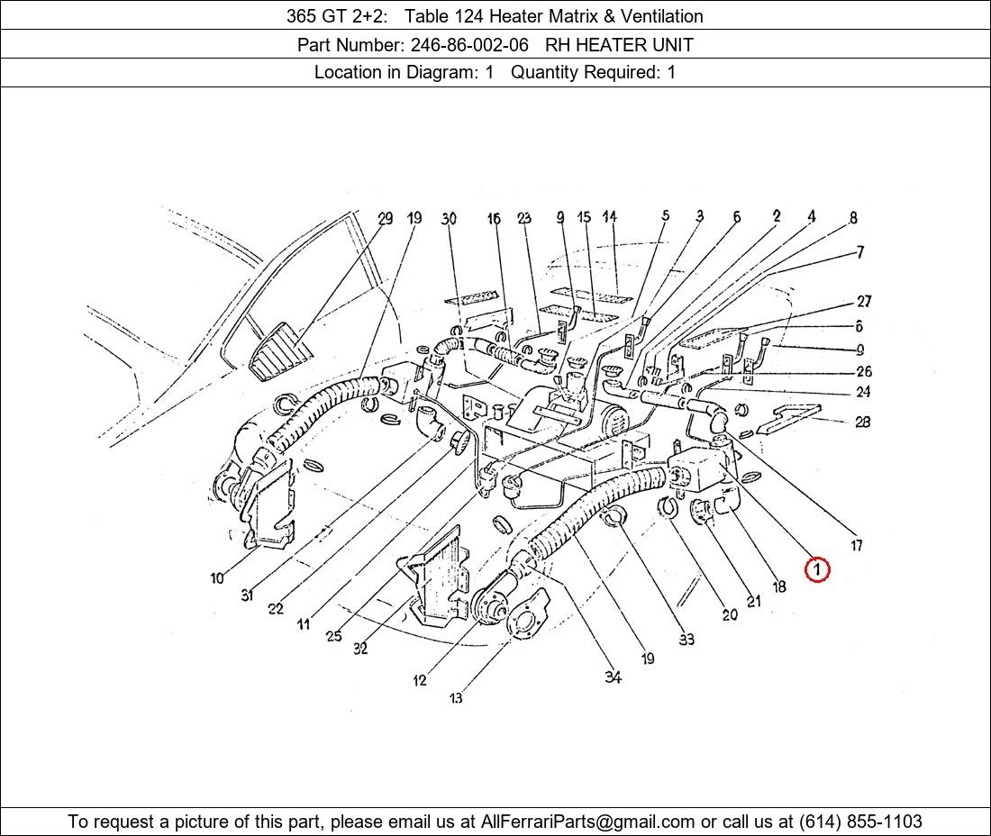 Ferrari Part Number 246-86-002-06, RH HEATER UNIT shown here as used in 365 GT 2+2 Table 124 Heater Matrix & Ventilation. Location in Diagram: 1. Required Quantity: 1