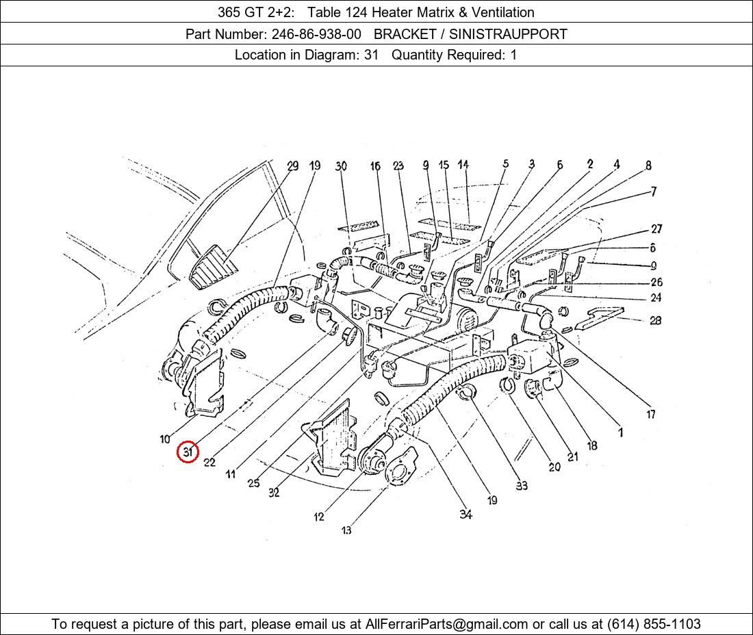 Ferrari Part Number 246-86-938-00, BRACKET / SINISTRAUPPORT shown here as used in 365 GT 2+2 Table 124 Heater Matrix & Ventilation. Location in Diagram: 31. Required Quantity: 1