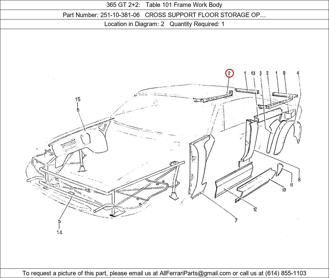 Ferrari Part Number 251-10-381-06, CROSS SUPPORT FLOOR STORAGE OP… shown here as used in 365 GT 2+2 Table 101 Frame Work Body. Location in Diagram: 2. Required Quantity: 1. This Ferrari part is used in more than one diagram. Click on the diagrams below to see alternative uses of this part: