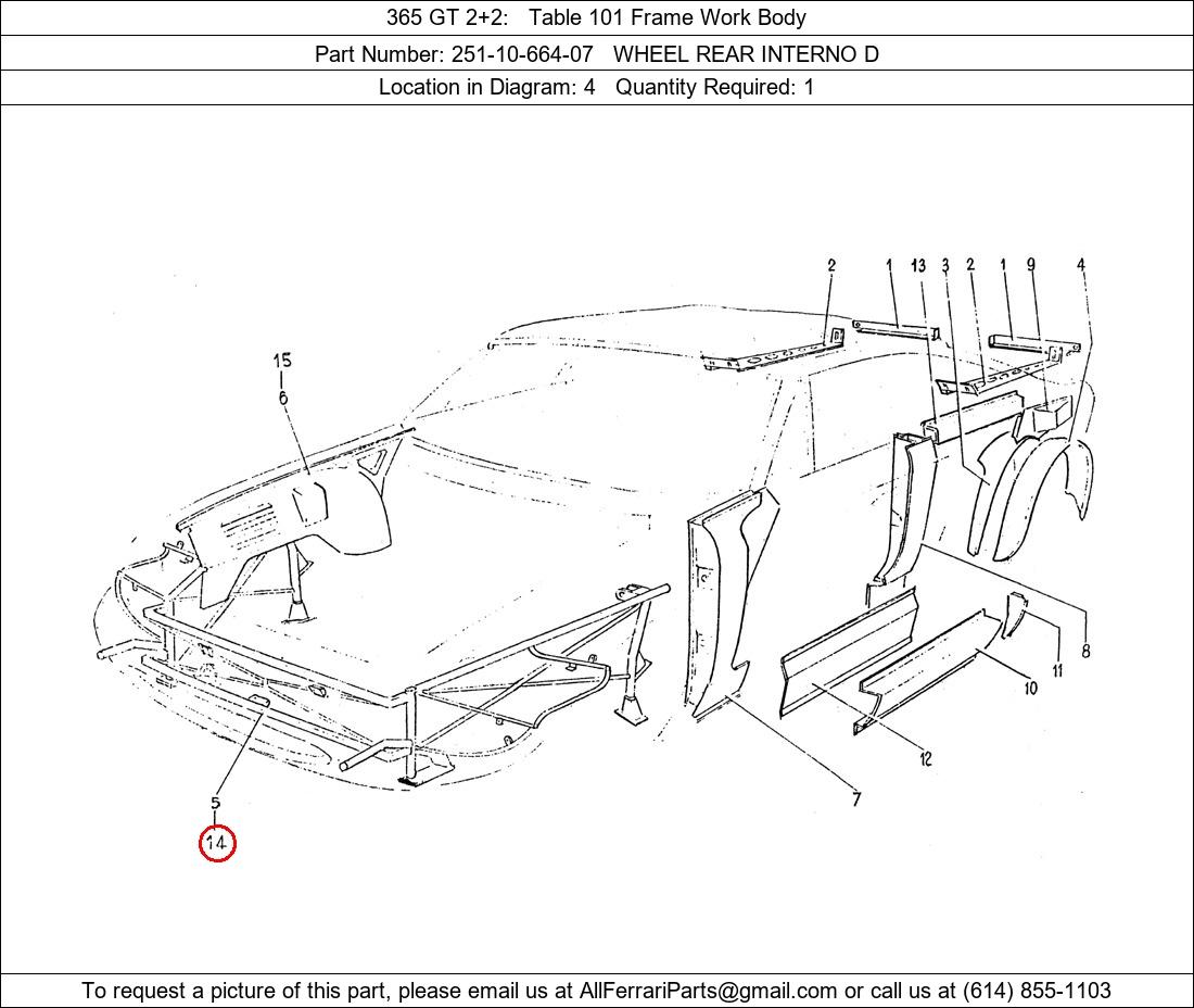Ferrari Part Number 251-10-664-07, WHEEL REAR INTERNO D shown here as used in 365 GT 2+2 Table 101 Frame Work Body. Location in Diagram: 4. Required Quantity: 1