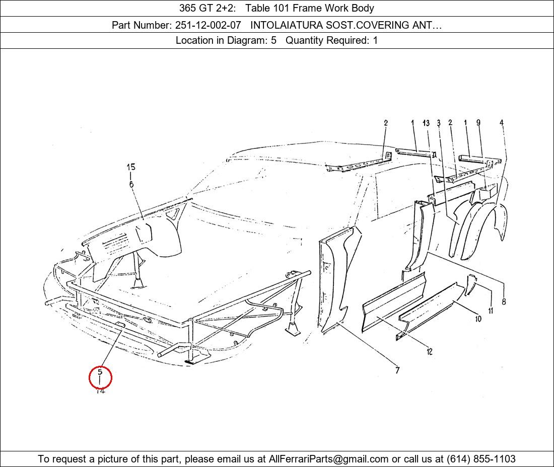 Ferrari Part Number 251-12-002-07, INTOLAIATURA SOST.COVERING ANT… shown here as used in 365 GT 2+2 Table 101 Frame Work Body. Location in Diagram: 5. Required Quantity: 1