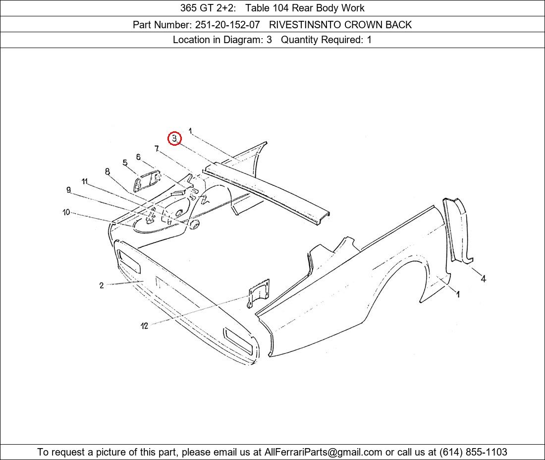 Ferrari Part Number 251-20-152-07, RIVESTINSNTO CROWN BACK shown here as used in 365 GT 2+2 Table 104 Rear Body Work. Location in Diagram: 3. Required Quantity: 1