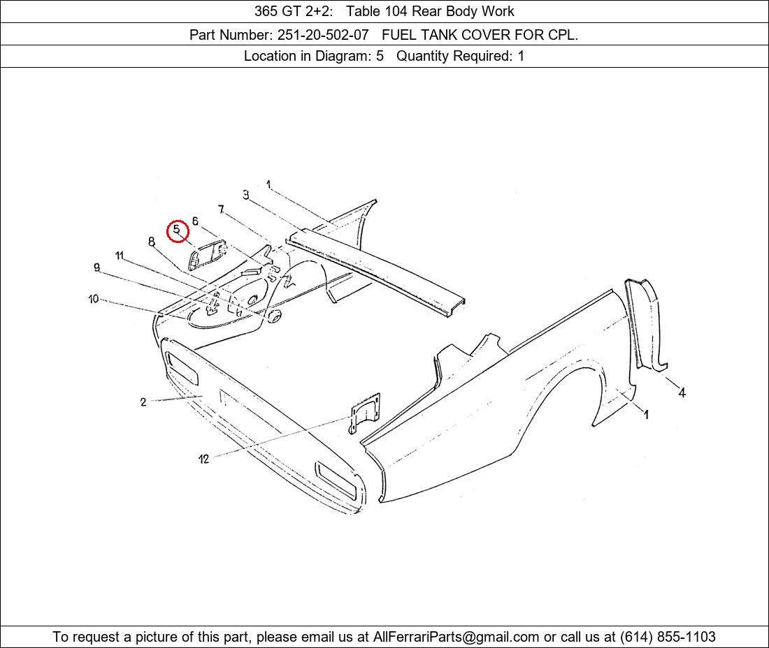 Ferrari Part Number 251-20-502-07, FUEL TANK COVER FOR CPL. shown here as used in 365 GT 2+2 Table 104 Rear Body Work. Location in Diagram: 5. Required Quantity: 1