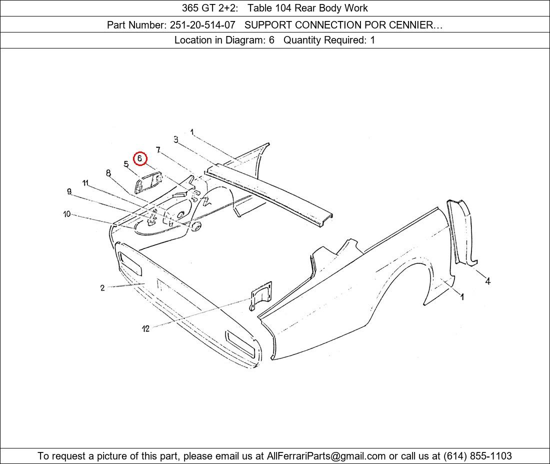 Ferrari Part Number 251-20-514-07, SUPPORT CONNECTION POR CENNIER… shown here as used in 365 GT 2+2 Table 104 Rear Body Work. Location in Diagram: 6. Required Quantity: 1