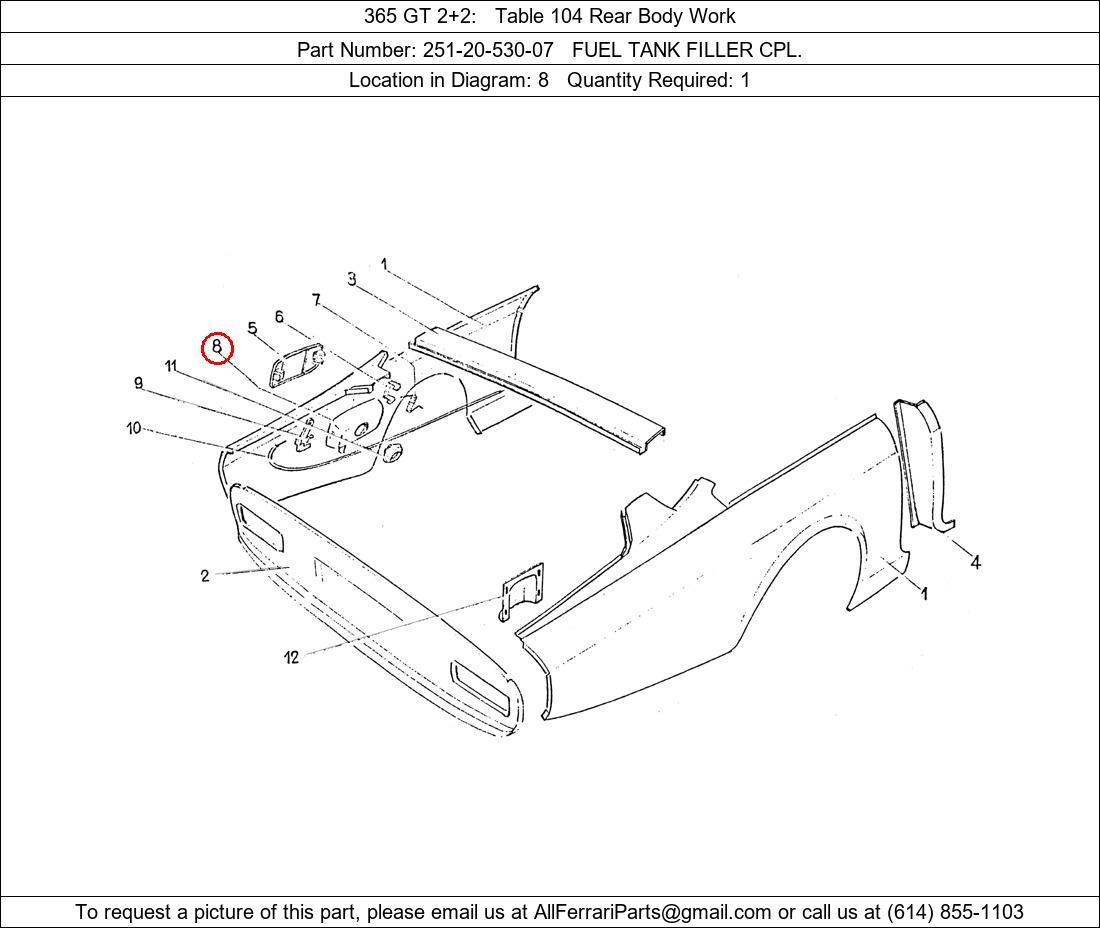 Ferrari Part Number 251-20-530-07, FUEL TANK FILLER CPL. shown here as used in 365 GT 2+2 Table 104 Rear Body Work. Location in Diagram: 8. Required Quantity: 1