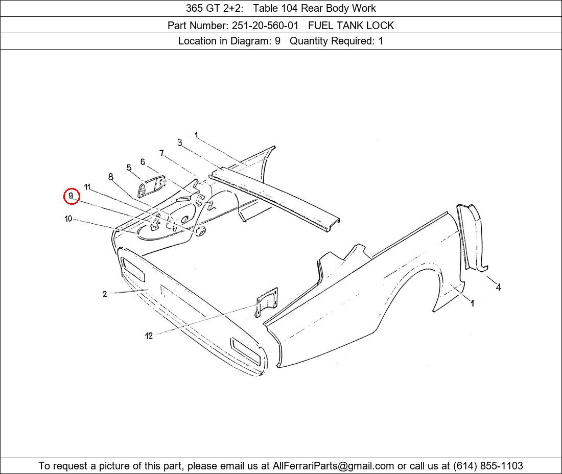 Ferrari Part Number 251-20-560-01, FUEL TANK LOCK shown here as used in 365 GT 2+2 Table 104 Rear Body Work. Location in Diagram: 9. Required Quantity: 1