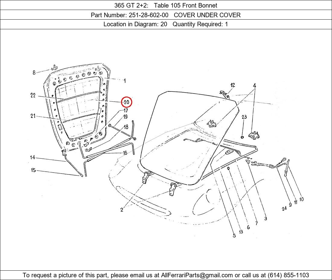 Ferrari Part Number 251-28-602-00, COVER UNDER COVER shown here as used in 365 GT 2+2 Table 105 Front Bonnet. Location in Diagram: 20. Required Quantity: 1