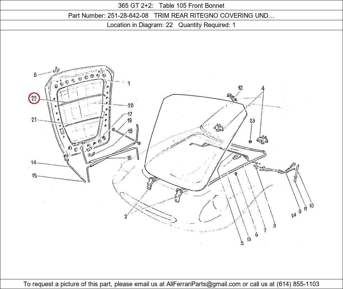 Ferrari Part Number 251-28-642-08, TRIM REAR RITEGNO COVERING UND… shown here as used in 365 GT 2+2 Table 105 Front Bonnet. Location in Diagram: 22. Required Quantity: 1