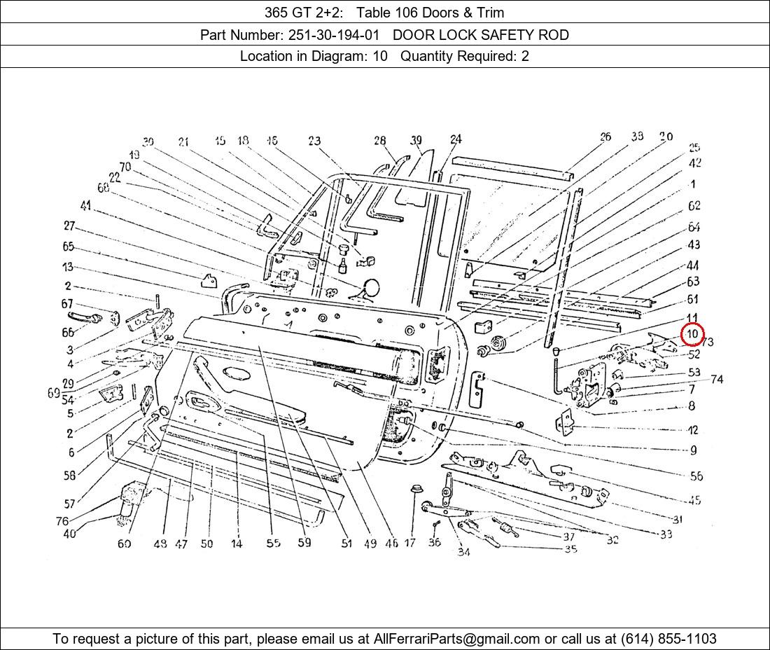 Ferrari Part Number 251-30-194-01, DOOR LOCK SAFETY ROD shown here as used in 365 GT 2+2 Table 106 Doors & Trim. Location in Diagram: 10. Required Quantity: 2. This Ferrari part is used in more than one diagram. Click on the diagrams below to see alternative uses of this part: