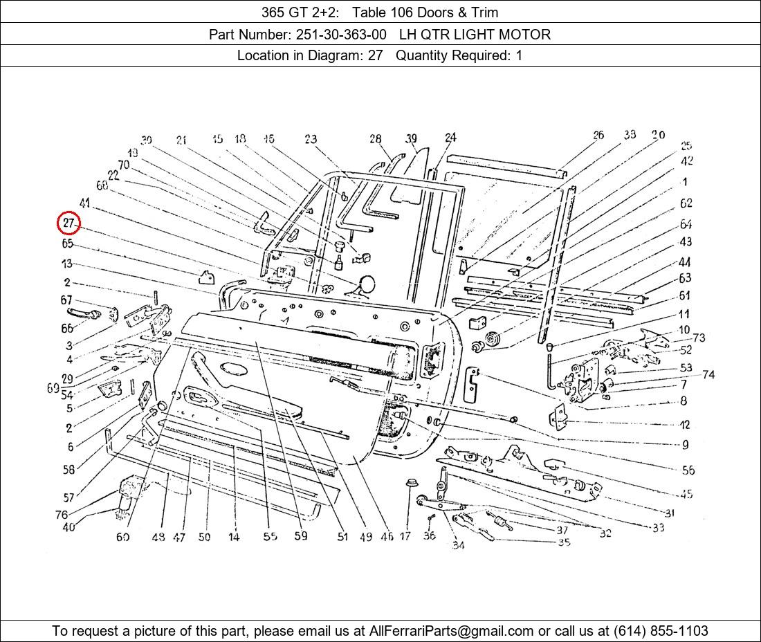 Ferrari Part Number 251-30-363-00, LH QTR LIGHT MOTOR shown here as used in 365 GT 2+2 Table 106 Doors & Trim. Location in Diagram: 27. Required Quantity: 1. This Ferrari part is used in more than one diagram. Click on the diagrams below to see alternative uses of this part: