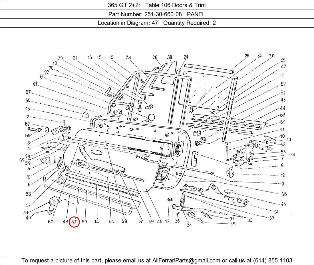 Ferrari Part Number 251-30-660-08, PANEL shown here as used in 365 GT 2+2 Table 106 Doors & Trim. Location in Diagram: 47. Required Quantity: 2. This Ferrari part is used in more than one diagram. Click on the diagrams below to see alternative uses of this part:
