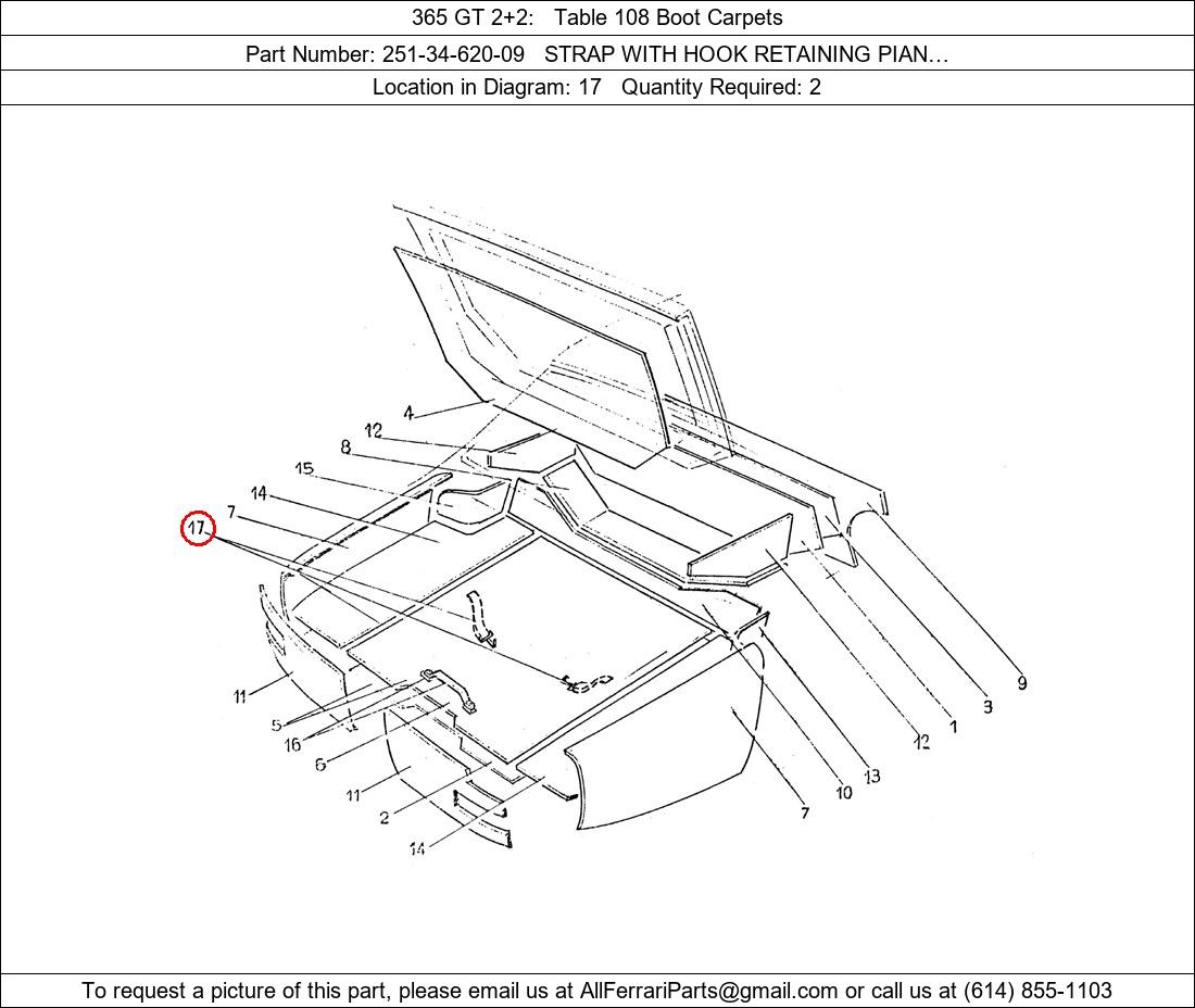 Ferrari Part Number 251-34-620-09, STRAP WITH HOOK RETAINING PIAN… shown here as used in 365 GT 2+2 Table 108 Boot Carpets. Location in Diagram: 17. Required Quantity: 2