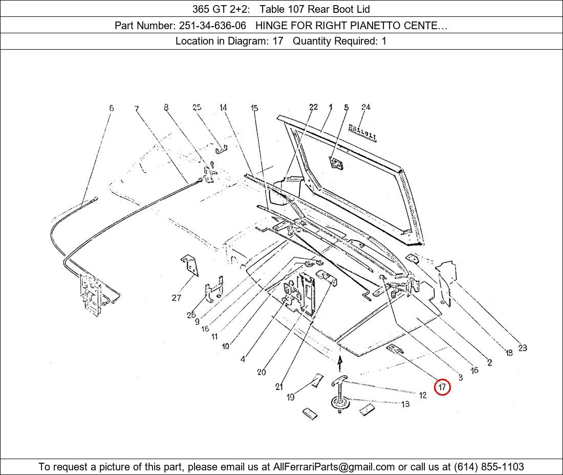 Ferrari Part Number 251-34-636-06, HINGE FOR RIGHT PIANETTO CENTE… shown here as used in 365 GT 2+2 Table 107 Rear Boot Lid. Location in Diagram: 17. Required Quantity: 1