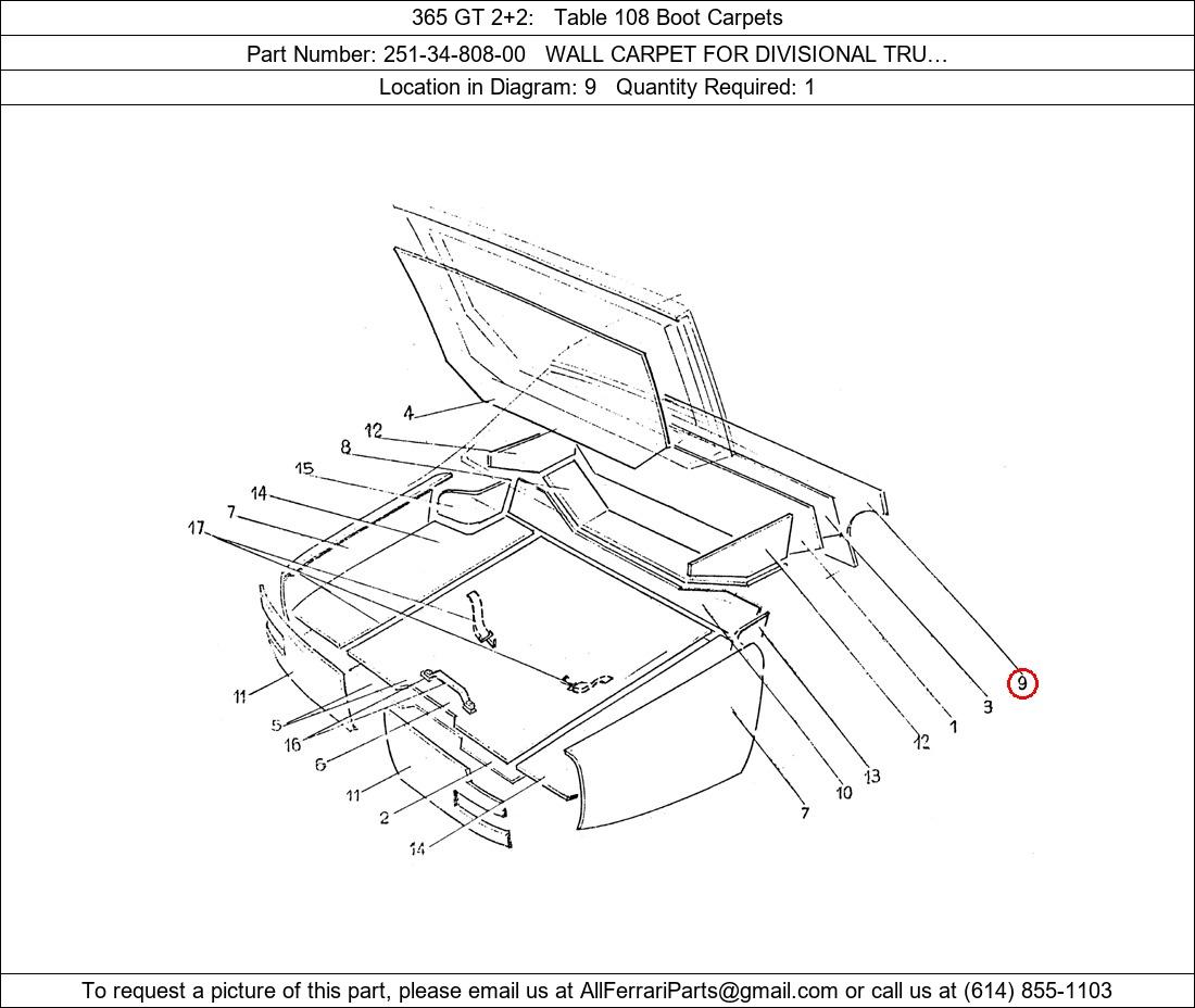 Ferrari Part Number 251-34-808-00, WALL CARPET FOR DIVISIONAL TRU… shown here as used in 365 GT 2+2 Table 108 Boot Carpets. Location in Diagram: 9. Required Quantity: 1