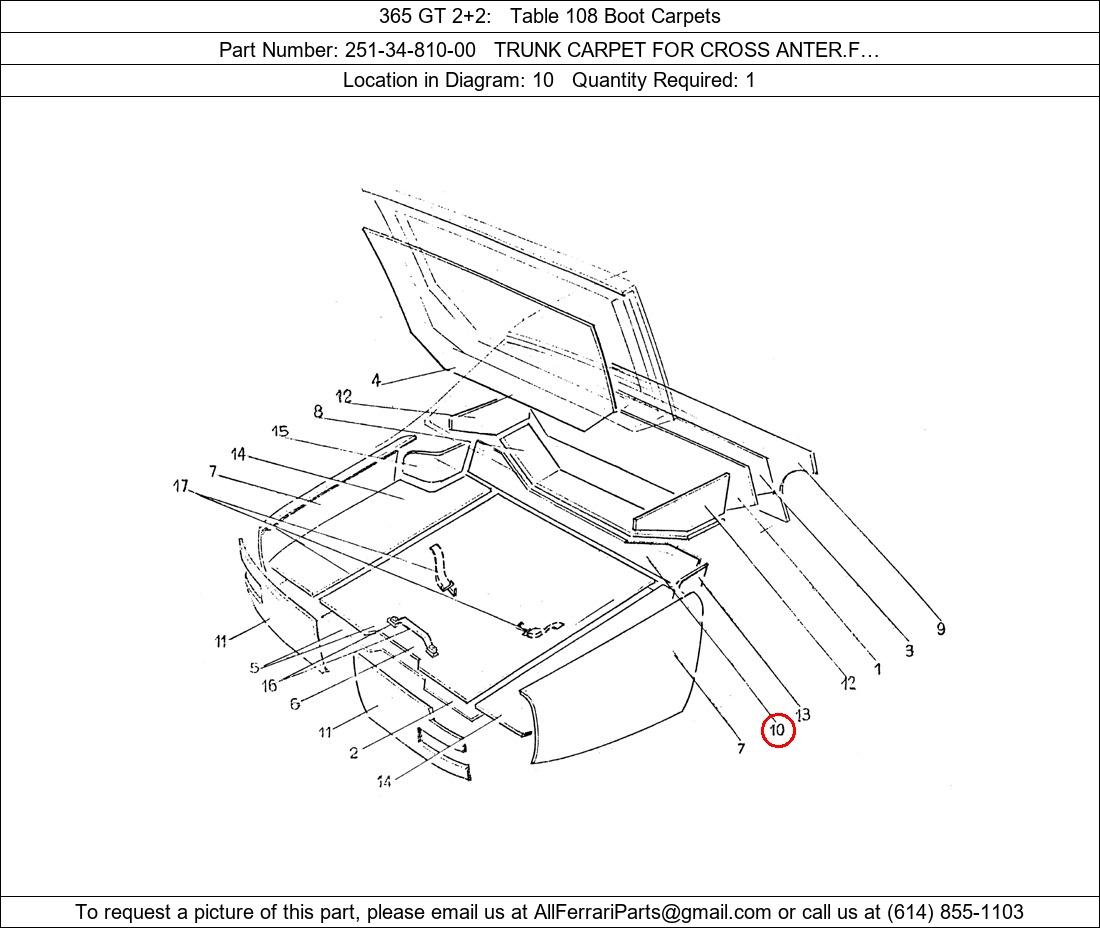 Ferrari Part Number 251-34-810-00, TRUNK CARPET FOR CROSS ANTER.F… shown here as used in 365 GT 2+2 Table 108 Boot Carpets. Location in Diagram: 10. Required Quantity: 1