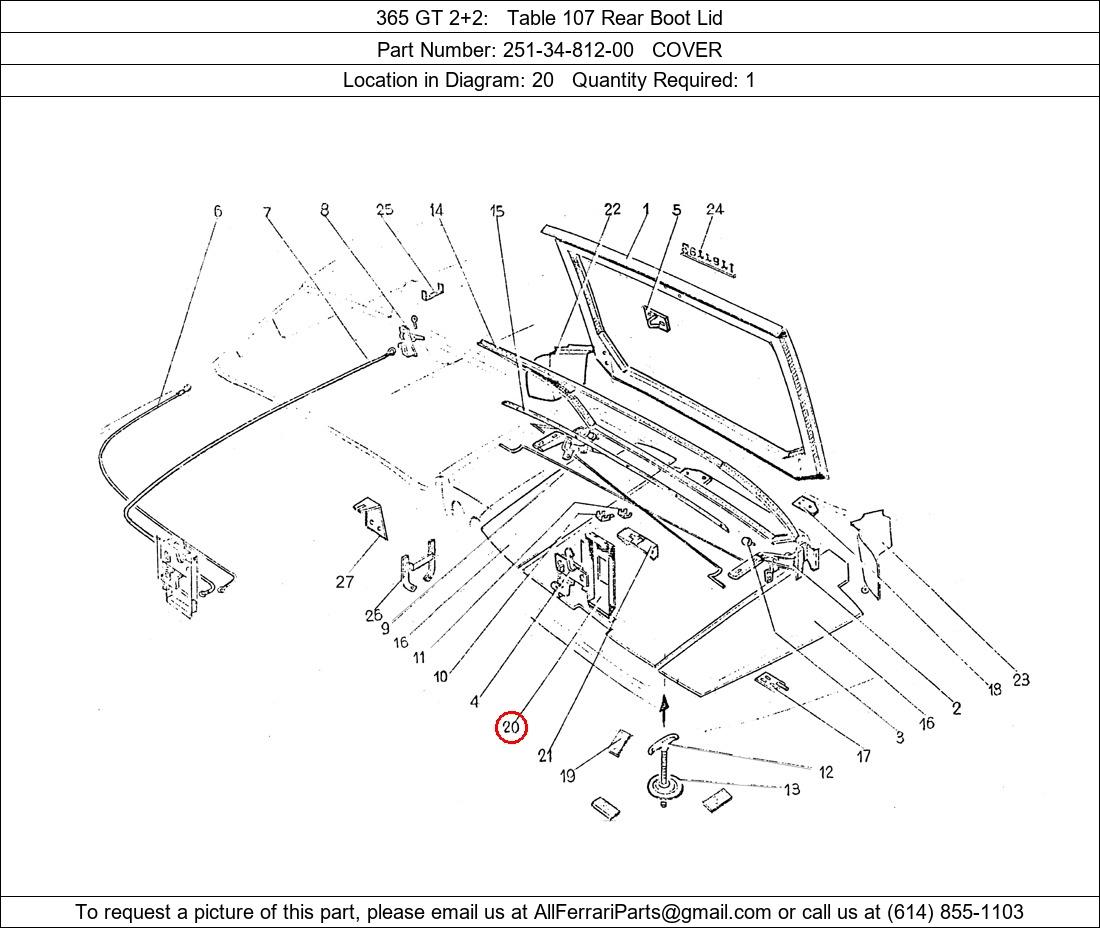 Ferrari Part Number 251-34-812-00, COVER shown here as used in 365 GT 2+2 Table 107 Rear Boot Lid. Location in Diagram: 20. Required Quantity: 1
