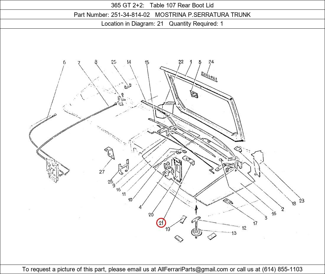Ferrari Part Number 251-34-814-02, MOSTRINA P.SERRATURA TRUNK shown here as used in 365 GT 2+2 Table 107 Rear Boot Lid. Location in Diagram: 21. Required Quantity: 1