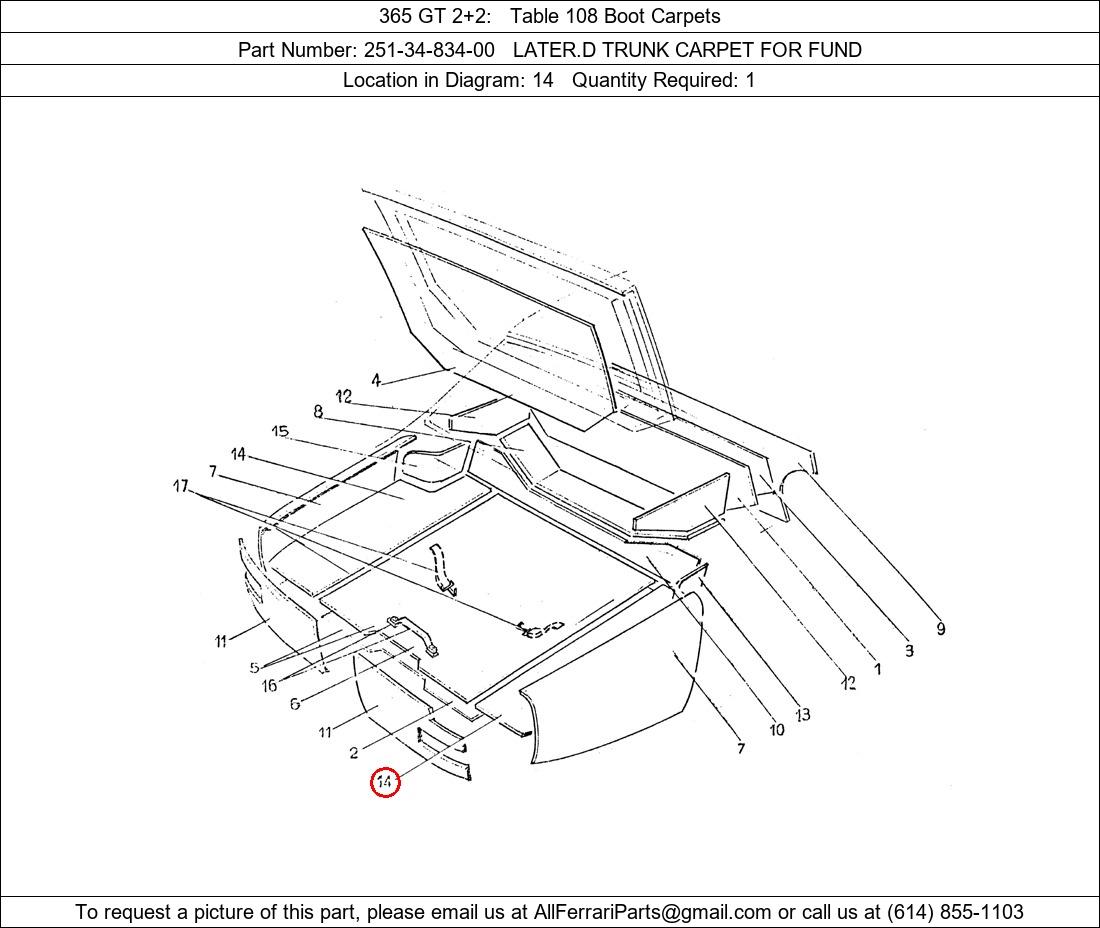 Ferrari Part Number 251-34-834-00, LATER.D TRUNK CARPET FOR FUND shown here as used in 365 GT 2+2 Table 108 Boot Carpets. Location in Diagram: 14. Required Quantity: 1