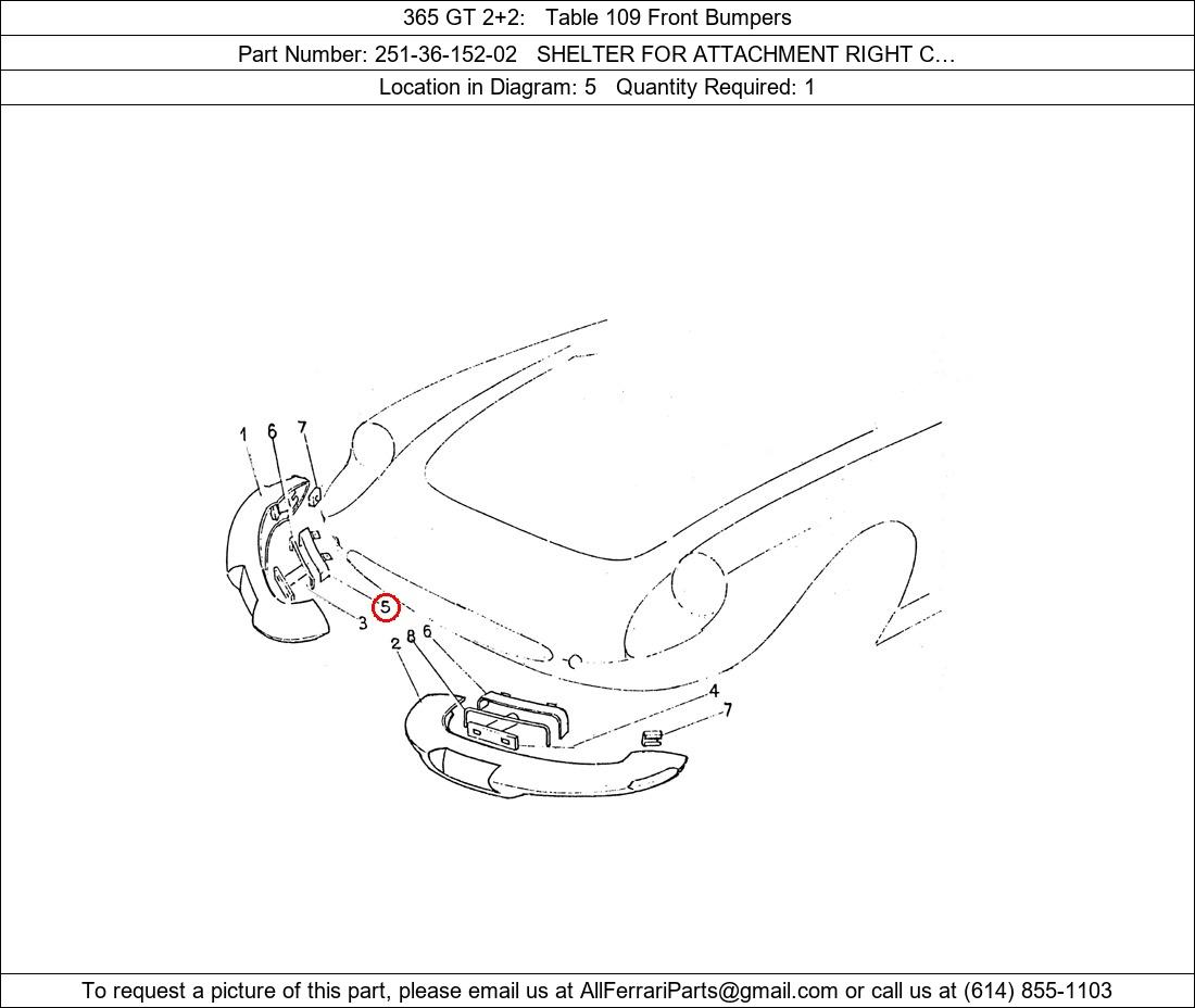 Ferrari Part Number 251-36-152-02, SHELTER FOR ATTACHMENT RIGHT C… shown here as used in 365 GT 2+2 Table 109 Front Bumpers. Location in Diagram: 5. Required Quantity: 1