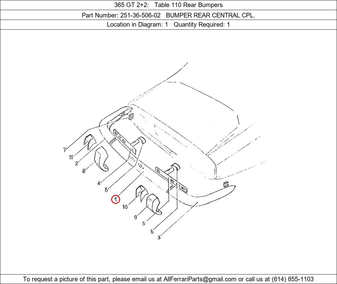 Ferrari Part Number 251-36-506-02, BUMPER REAR CENTRAL CPL. shown here as used in 365 GT 2+2 Table 110 Rear Bumpers. Location in Diagram: 1. Required Quantity: 1