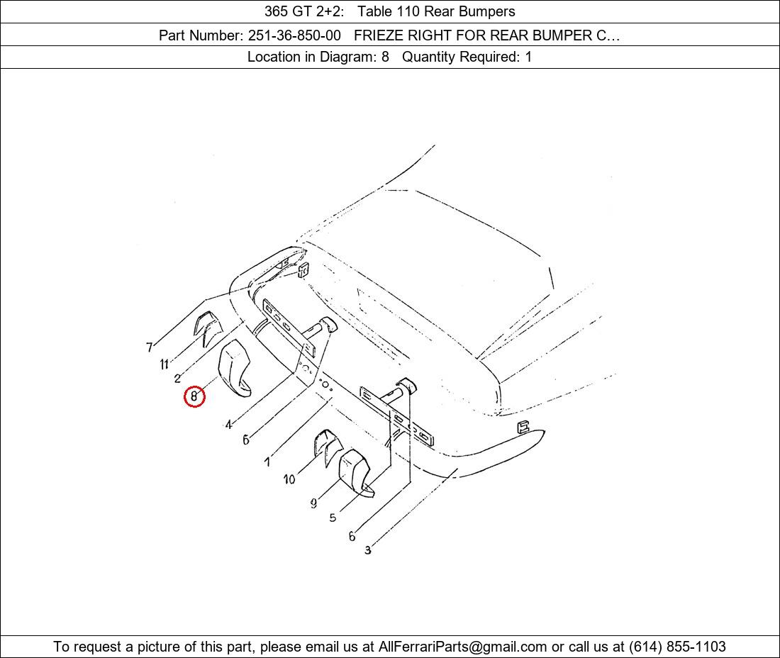 Ferrari Part Number 251-36-850-00, FRIEZE RIGHT FOR REAR BUMPER C… shown here as used in 365 GT 2+2 Table 110 Rear Bumpers. Location in Diagram: 8. Required Quantity: 1